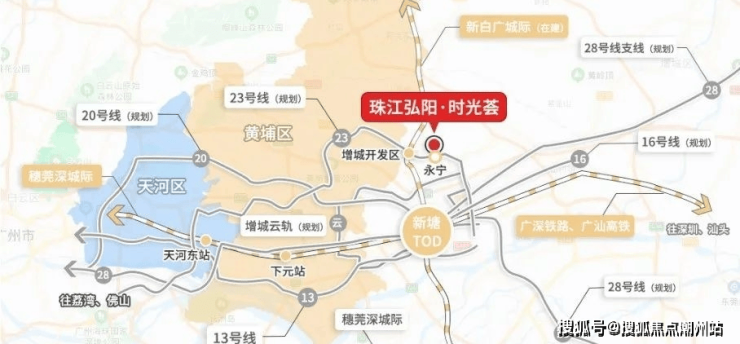 交通方面珠江弘阳·时光荟紧邻新白广城轨和地铁23号线-永宁站(规划中),紧靠增天高速,实现“高速+地铁+公交”全覆盖,1站新塘TOD,2站黄埔(夏园站),3站天河(吉山站)。