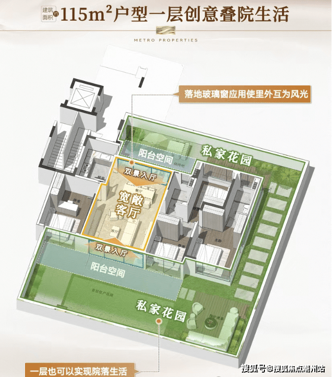 “玥境”为滨江小洋楼,主打112-130㎡低密叠院,最大亮点是超高赠送率,1F、2F户型赠送私属花园,3F赠送超大景观露台,4F复式设计,赠送顶层天台。