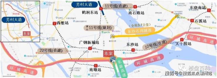 地铁——6条地铁线5个站:广州地铁1号线西塱站(距离2公里);广佛线鹤洞站(距离 2 公里);广州地铁10号线花围站(高德测距约 900 米);广州地铁11号线鹤洞东站(高德测距约2公里);广州地铁22号线南教站(高德测距约400米);佛山地铁11号线花围站(高德测距约900米);