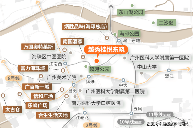 交通配套:距离地铁8号线晓港地铁站仅0.6km,8号线可以直达琶洲、客村等商务圈,一站到昌岗可以换乘2号线,到南站、白云新城也比较方便,三站客村换乘3号线,到珠江新城、体育西路,能实现40min内通勤。
