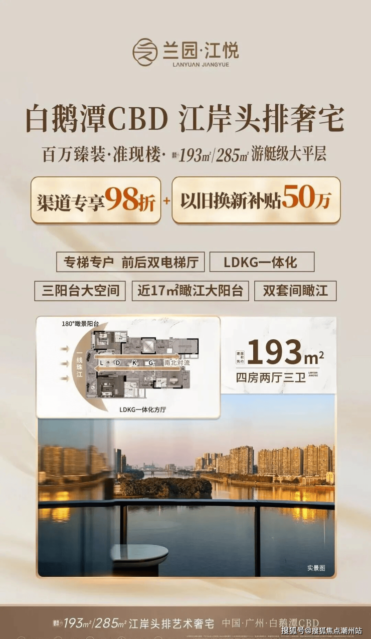 广州兰园江悦项目位于三江交汇处,占据珠江稀缺头排江景,顶藏级豪宅奢阔尺度,筑就时间之上的滨江恒产。项目位于荔湾区白鹅潭CBD核心地带,紧邻星河江缦,被誉为金桥地块二期,交标也是天花板级别的。项目傲居白鹅潭CBD,便捷交通路网,500米地铁站。白鹅潭定位“广州西翼CBD”,对标纽约、芝加哥、东京等世界级中央商务区,以200万平方米体量晋升广州5大世界级商圈之首。