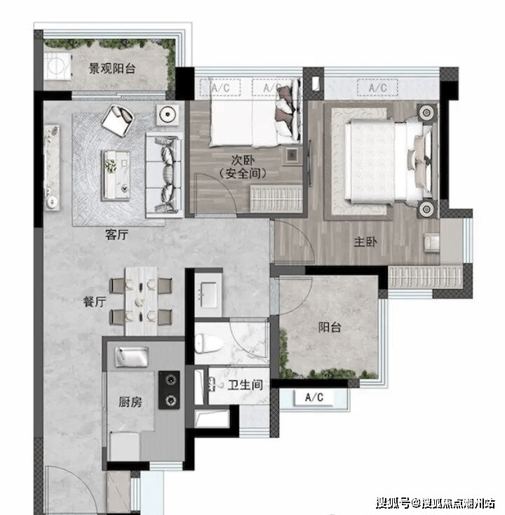 全屋多达6处飘窗赠送,主卧正面飘窗+转角飘窗、玄关飘窗、次卧飘窗、公卫飘窗