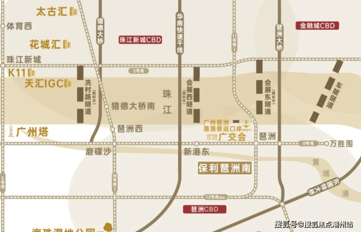 交通配套:项目距离广州地铁8号线和11号线的琶洲站仅900米,步行即可到达。
