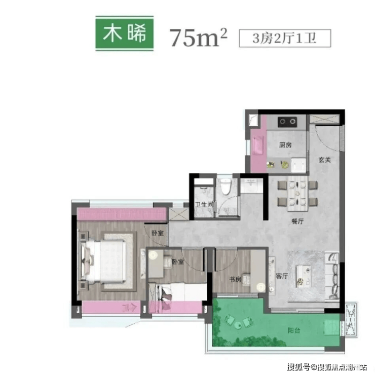 75㎡三房卫,四开间朝南,约5.2米大阳台,超10米南向展面。