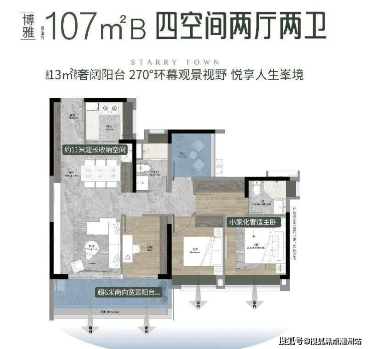 【107㎡B 4空间2厅2卫】四开间朝南,经典竖厅设计,动静分区。多功能空间尺度宽阔,满足二胎家庭。精细化收纳,超11米收纳墙。主卧自带独立衣帽间,太太的买买买都装得下。