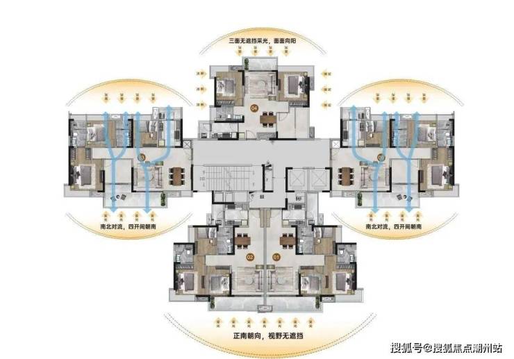 第一,楼栋采用 南向点式布局 ,保证了采光、通风,也让整体空间形态舒朗;