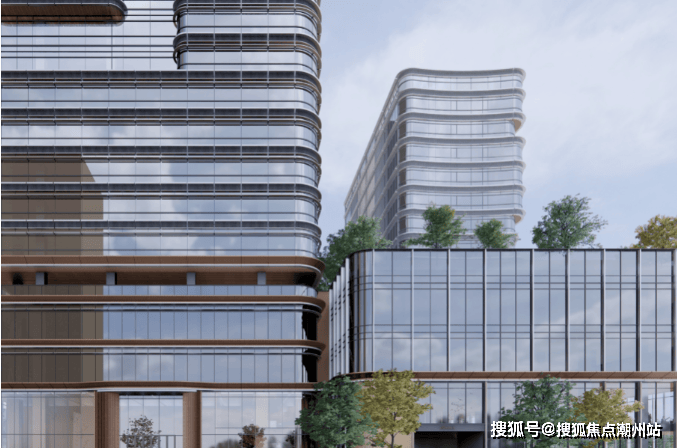 外立面采用木色陶板与全景玻璃幕墙,以“曲水流觞”的涟漪造型呼应珠江文脉,同时融入垂直生态理念,打造空中绿岛与可呼吸的建筑肌理。