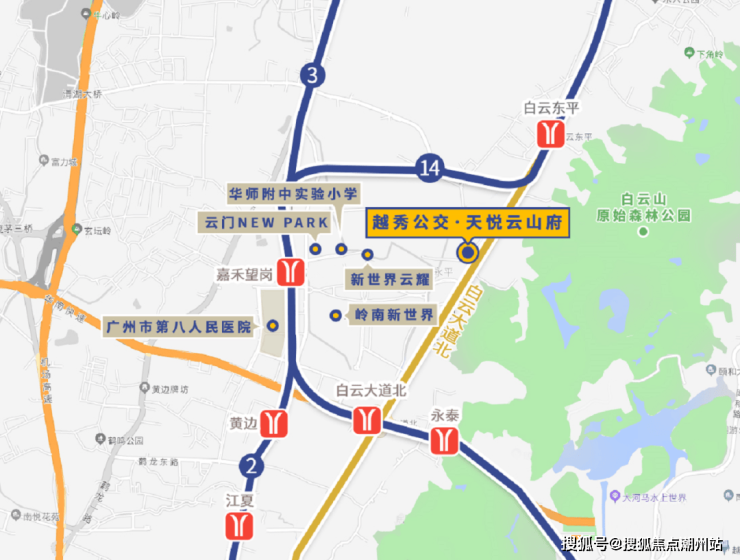 越秀公交.天悦云山府虽然不近地铁,距离14号线东平站步行距离1.7km,距离2/3号线嘉禾望岗站、白云大道北站步行距离约2km;无车一族需要公交接驳,但项目楼下就是公交TOD站点,可以通过公交无缝接驳2/3/14号线、18号线(在建)。下楼坐电梯直达公交站场,换乘地铁也就三四个站。
