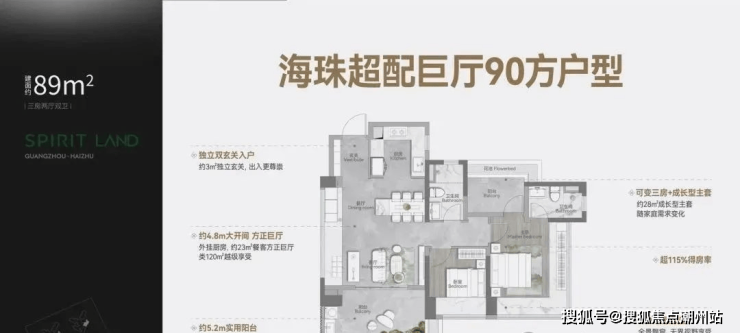 建面约89㎡ 三房两厅两卫;海珠使用率ZUI高产品 约115%,内外双玄关 ;LDKG+X一体化 约4.8m越级巨厅 ,中西分厨 豪宅化设计理念 ;约28㎡成长型大主套 灵动可变三房 ,270°全景飘窗 无限广角。