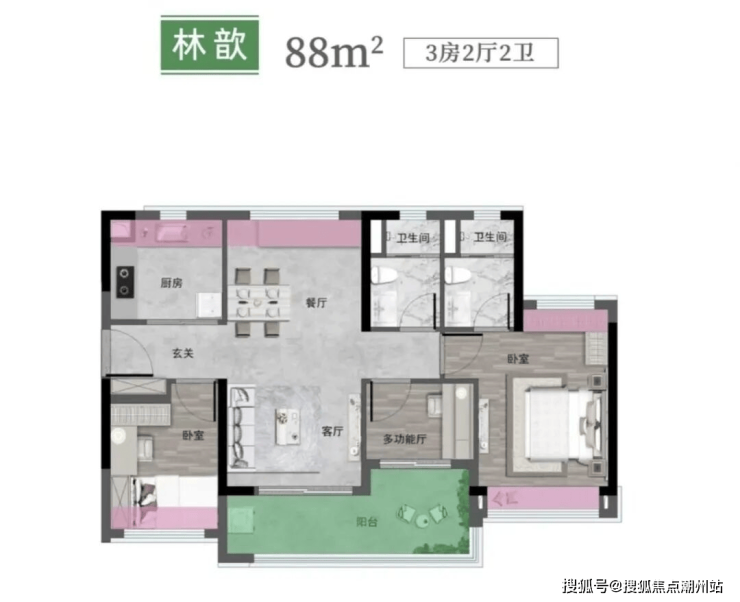 86/87㎡三房两卫,全南向四开间、三卧室朝南,南北通透,约5.6米L型大阳台,超11米南向展面。