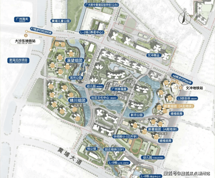 「3地铁交汇,直达珠江新城」。5号线、13号线、7号线二期,三地铁交汇;文冲、大沙东、裕丰围、双岗,四地铁站环绕;7号线二期2023年底开通,南下通往番禺万博、广州南站,北上通往科学城;13号线二期2024年10月开通,向西通往花城广场、越秀、白云等,向东联通新塘TOD;