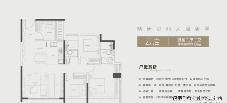 【云启】建面约107㎡四房两厅两卫大致格局类似,入户玄关旁多一个次卧,动区也改成ldkb一体化大方厅,家里开party都够用了