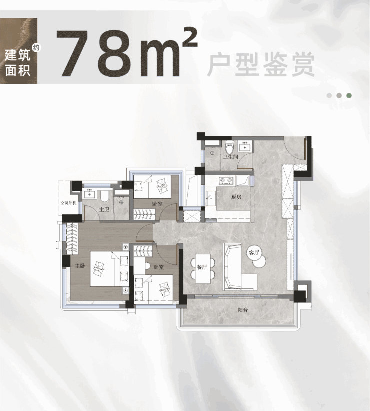 【建面约 78 ㎡三房两卫】建面使用率高达 115%-121%(套内使用率 144-152%);使用面积约 90-95 ㎡