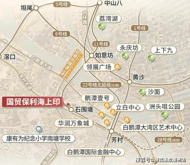 国贸保利海上印项目邻近芳村大道中,与山村旧改项目仅一路之隔,属于白鹅潭商务区,周边分布多个茶叶市场,一站地铁可达万象城、白鹅潭艺术中心等高端配套。