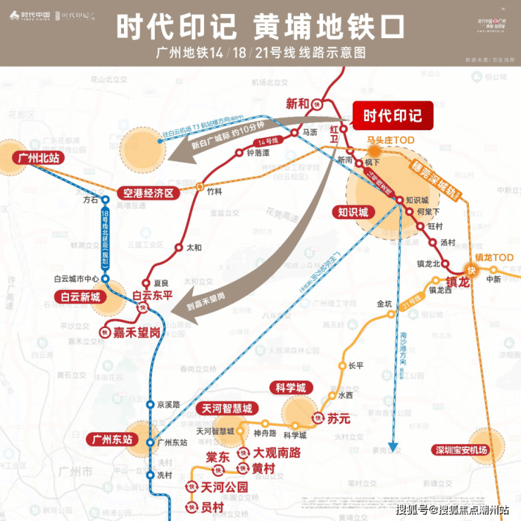 时代印记位于知识城起步区,红卫地铁站附近,是红卫村的旧改项目,靠近地铁口的是它的回迁房,在售的那一边距离红卫地铁口大概400多米的样子。是一座为50万人提供生活、工作、学习、休闲全方位发展型的新城。