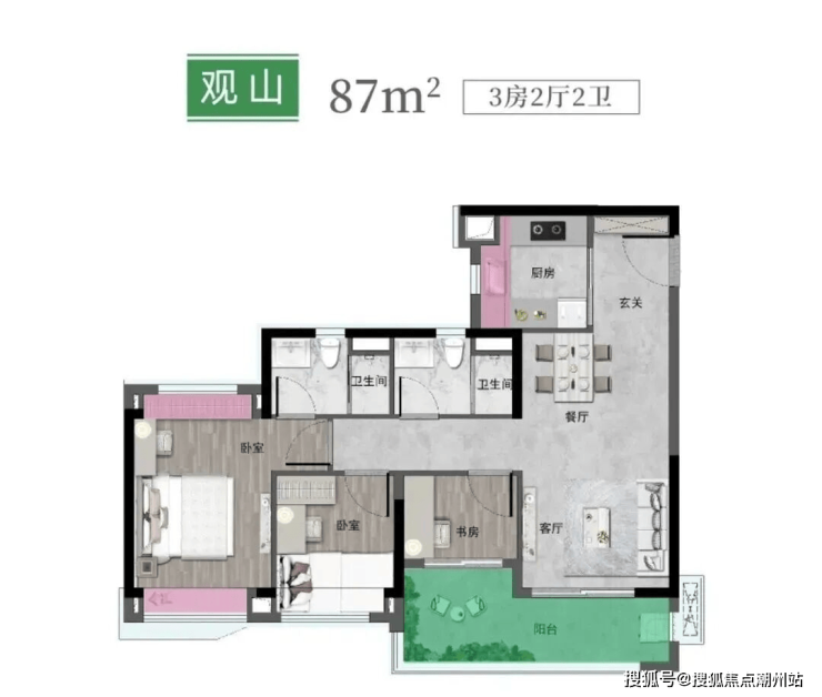 86/87㎡三房两卫,全南向四开间、三卧室朝南,南北通透,约5.6米L型大阳台,超11米南向展面。