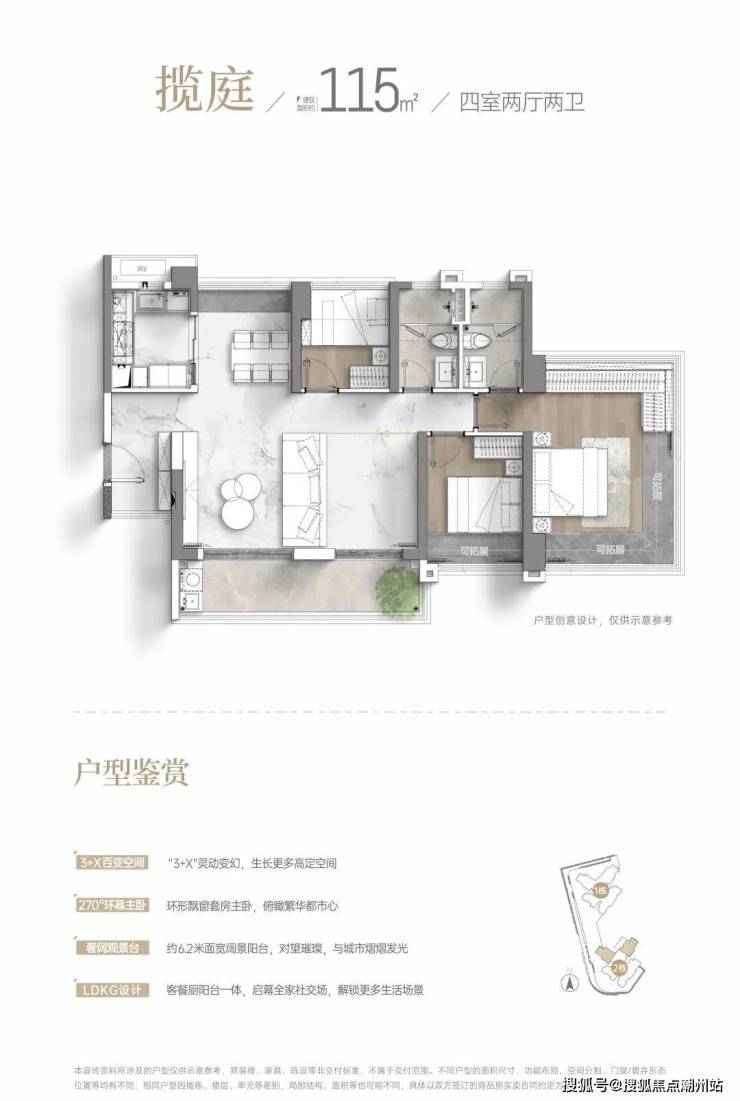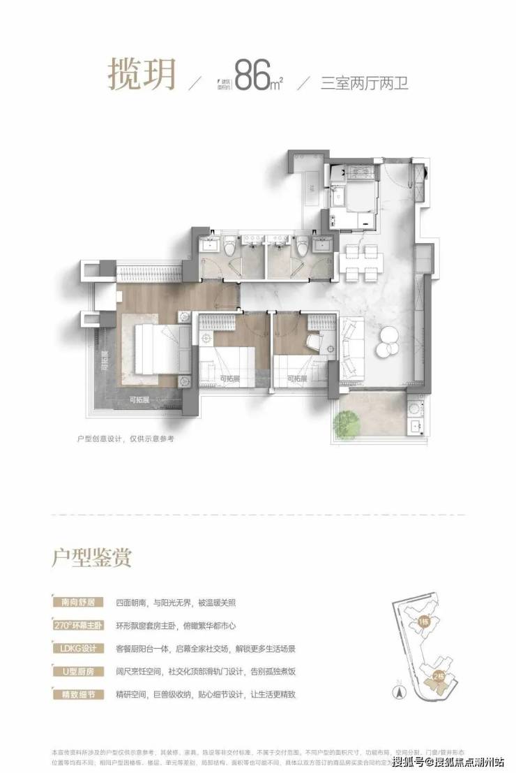 项目首开还是1、2栋,位于丰乐路和黄埔东路交界,1栋47层3T5,2栋31层2T5,分别有建面约86、95、115㎡三种全南向户型,使用率超100%。