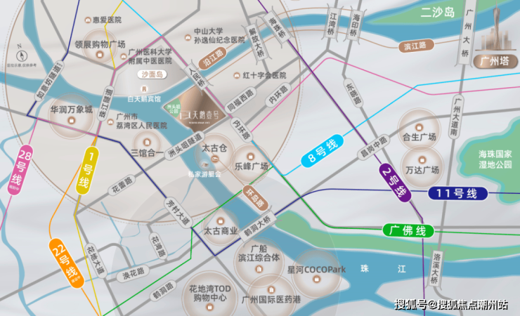 天鹅壹号作为白鹅潭核心的高端滨江豪宅,展现了独特的地理与设计优势。该项目位于海珠西,距离同福西路地铁站仅700米,交通便捷,8号线快速连接珠江新城,方便到达广州南站及机场。其周边覆盖华润万象城、太古商业等高端商圈,还拥有中山大学第一附属医院等一流医疗资源,为业主提供完善的生活配套。