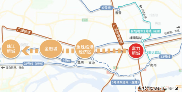 富力新城项目周边距离在建设中的有轨电车2号线严田站1.8公里,还可以通过笔村公交站可以无缝对接地铁13号线和6号线,使得居民可以轻松直达萝岗香雪,并通过多条路线前往天河、萝岗和新塘。