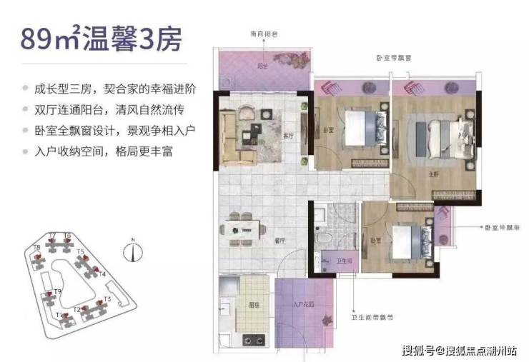 建面约110㎡的阔绰三房,纯南北对流户型,且设计约7米宽的南向大横厅,似将要把整个阳光揽入屋中。增加了一个生活阳台,美观收纳更实用。